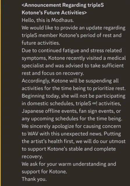 这番真情流露,迅速引发了粉丝对经纪公司行程安排是否合理的广泛讨论。然而,风波未平,MODHAUS的官方公告接踵而至。公司声明称,Kotone因“持续的疲劳和压力相关症状”咨询了医生,并被建议需要充分休息,因此将暂时中止所有国内外活动,以专注于恢复。