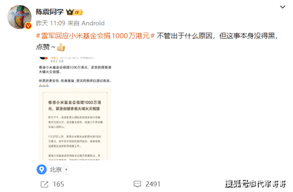 仅仅一个多月后,陈震又因不当言论陷入更大舆论危机。11 月 27 日,小米公益基金会宣布捐赠 1000 万港元,紧急驰援香港大埔火灾救援,这是一次充满爱心与正能量的公益行为,本应得到社会各界赞扬。可陈震在转发相关微博时,一句 “不管出于什么原因,但这事本身没得黑,点赞”,却引发轩然大波。看似中立客观的表述,却被众多网友解读为 “阴阳怪气”,暗指他对小米捐款动机存在质疑,表面点赞实则暗讽。在网络这个放大镜下,每一句话都可能被无限放大,更何况是出自拥有千万粉丝的大 V 之口。一时间,网友们纷纷在评论区留言指责,其他博主也加入声讨行列,直言他是在蹭小米热度,消费公益事件。