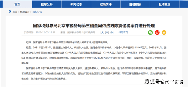 这场突如其来的禁言引发轩然大波,网友们纷纷猜测原因,各种小道消息在网络上流传。仅仅相隔一天,即 12 月 5 日下午,央视新闻及税务部门的一则通报,犹如一颗重磅炸弹,瞬间让事件真相大白。原来是经北京市税务局第三稽查局长时间的缜密调查与取证,查明陈震在 2021 - 2023 这三年间,通过一系列隐蔽且违规的手段,进行税务操作。他将本应光明正大申报纳税的个人收入,想方设法隐匿起来,或是巧妙地转换收入性质,让其披上看似合法的外衣,甚至在纳税申报环节公然弄虚作假,最终导致少缴个人所得税达 118.67 万元。如此行为,严重扰乱税收征管秩序,税务部门依据严格的法律法规,对他作出严肃处理,追缴其少缴的税款,加收相应滞纳金,并施以罚款,三项合计高达 247.48 万元。值得一提的是,在税务部门雷厉风行的行动下,涉案款项已全部顺利入库,彰显法律的威严与税务执行的高效。