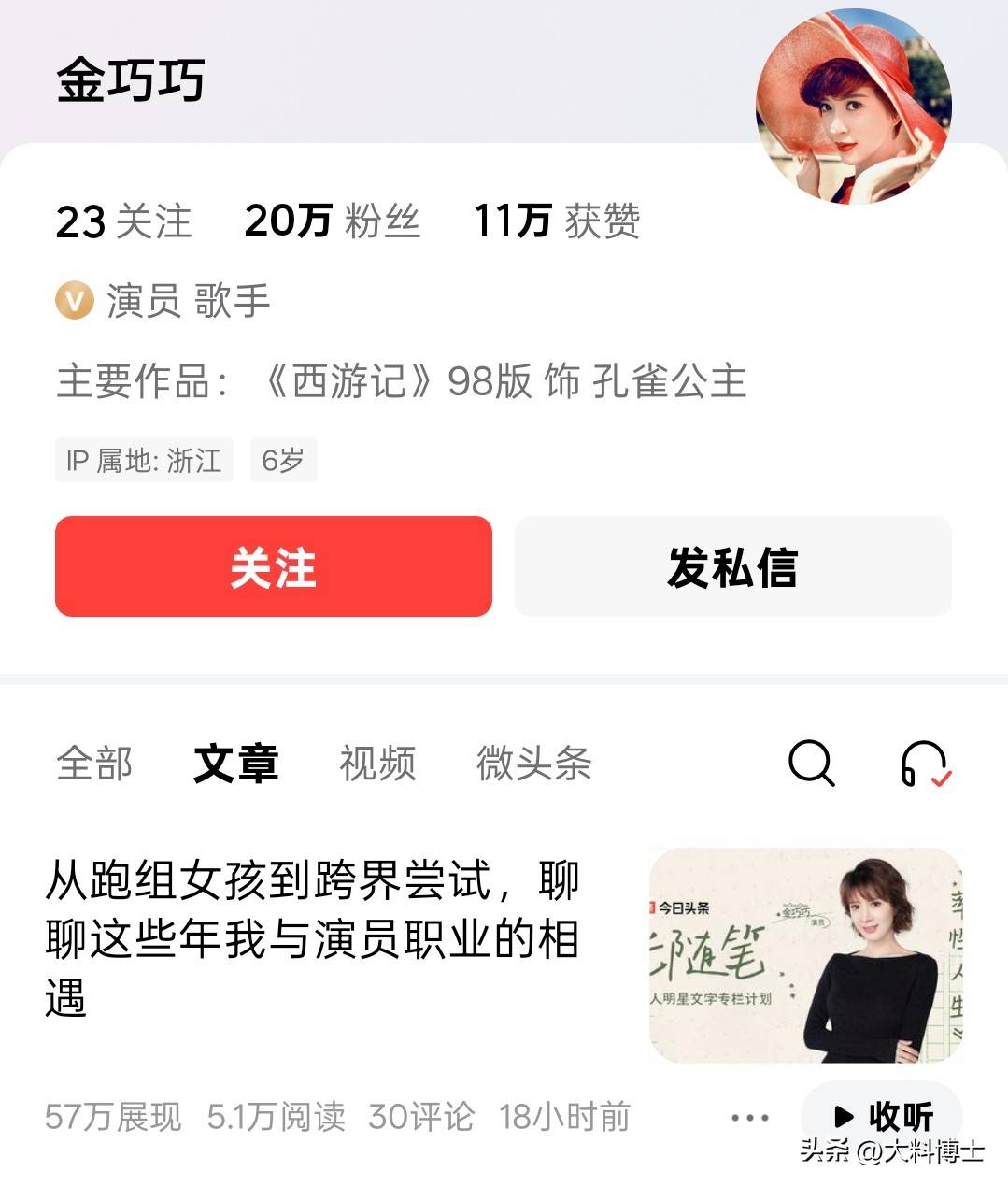 谁能想到,当年在荧屏中活跃的大明星金巧巧,居然入驻今日头条写文章了!