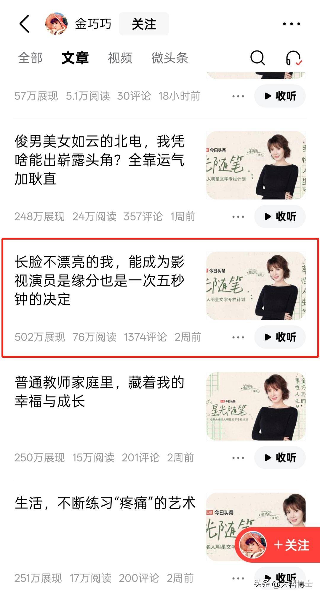 近日,有网友发现,演员金巧巧已在今日头条发表了数篇文章,文章内容以《金巧巧的率性人生》主题展开,明星写文是今日头条名人、明星专栏计划之一,明星入驻可能有相关资金、流量扶持。