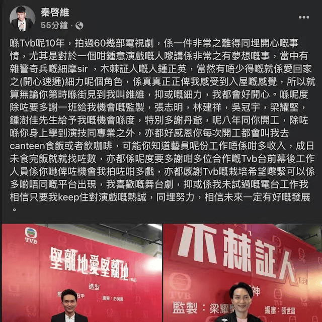 TVB的贵为香港第一大电视台,过去的辉煌也是历历在目。鼎盛时期明星都想突破门槛一头扎进TVB。不过如今的TVB也是在夹缝中生存,不时还传出演员离巢的消息。近日,男艺员秦启维也在社交平台上,承认自己已经离开TVB。