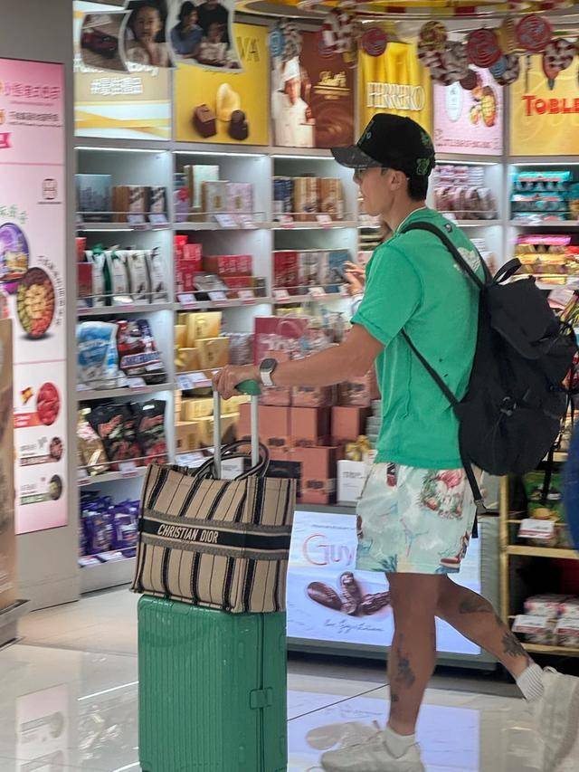 他手推着大箱子,背上还背着包,没有带助理,看着就特别踏实。