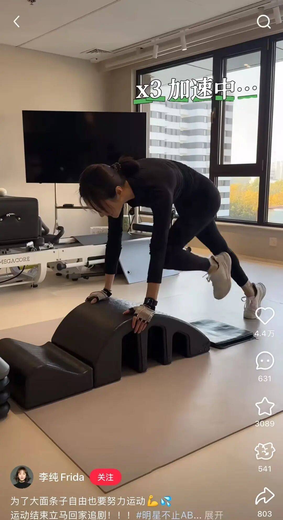 李纯晒出了自己在健身房运动的vlog,并配文:为了大面条子自由也要努力运动。