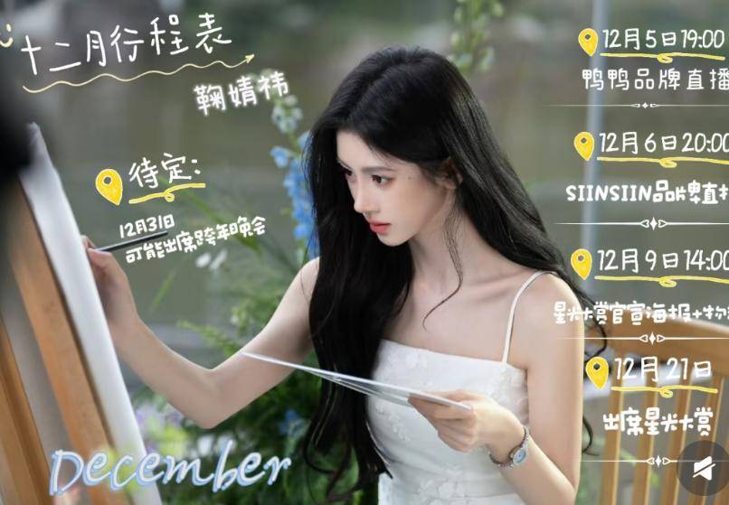鞠婧祎的12月行程图也没什么亮点,没有进组,今年5部待播剧一个都没播,沉寂了很久。