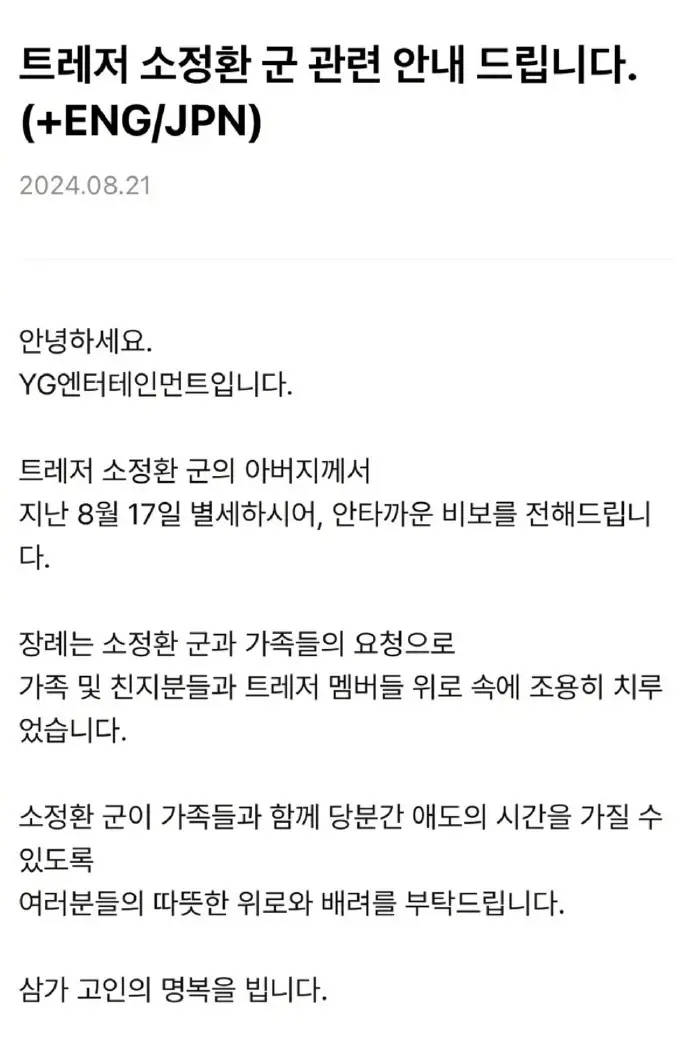 搜狐娱乐讯 21日,YG发布公告,苏庭焕父亲于8月17日去世。公告表示:“葬礼按苏庭焕及其家属的要求,在家人、亲戚和TREASURE成员的安慰下安静地进行了,为了让苏庭焕和家人一起度过一段哀悼的时间,请大家给予温暖的安慰和关怀,祈求故人在天之灵得以安息。”