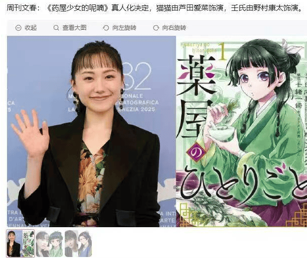 前两天,周刊文春爆出了消息说《药屋少女的呢喃》要拍真人版了,其中女主角猫猫由芦田爱菜饰演,男主角壬式则是由野村康太饰演。