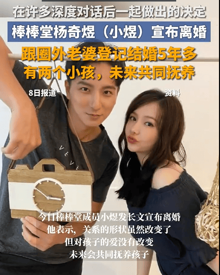 据悉,杨奇煜跟圈外老婆言言登记结婚5年多,有两个小孩。