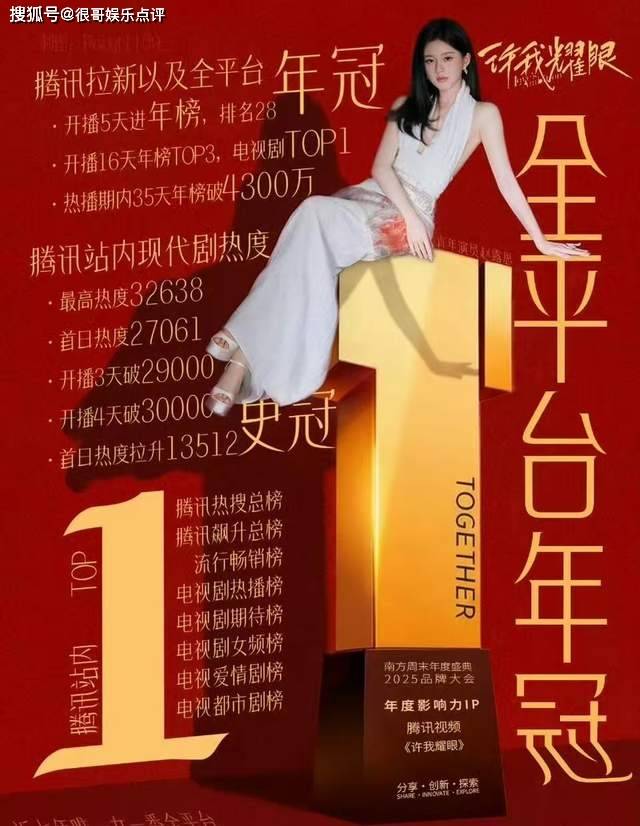 赵露思凭借年度热剧《许我耀眼》成为焦点,该剧全平台播放量破百亿,斩获16项权威数据榜单冠军,41.7%的云合播放量市占率拿下腾讯年度冠军。她跳出甜宠剧舒适圈,完成从天真烂漫到心机坚韧的角色转型,与陈伟霆的对手戏引发大量二次创作,“双压轴”传闻让其热度居高不下。