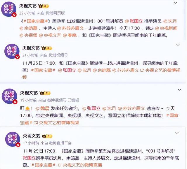 最近《国家宝藏》周游季筹备走进福建漳州寻宝,央视文艺频道接连四次发文预热宣传,每篇推送里都特意点出 “001 号讲解员张国立”。