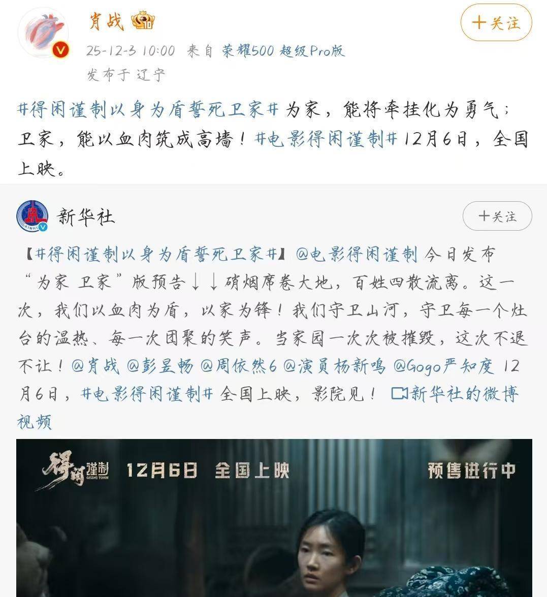 12月3号,肖战在自己社交账号上放出了电影《得闲谨制》的预告视频。