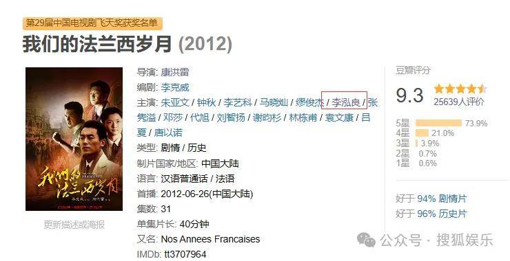 李泓良另一个让人难忘的角色就是《我们的法兰西岁月》中的“赵世炎”一角。这部剧豆瓣高达9.3分,李泓良演的有多好呢?