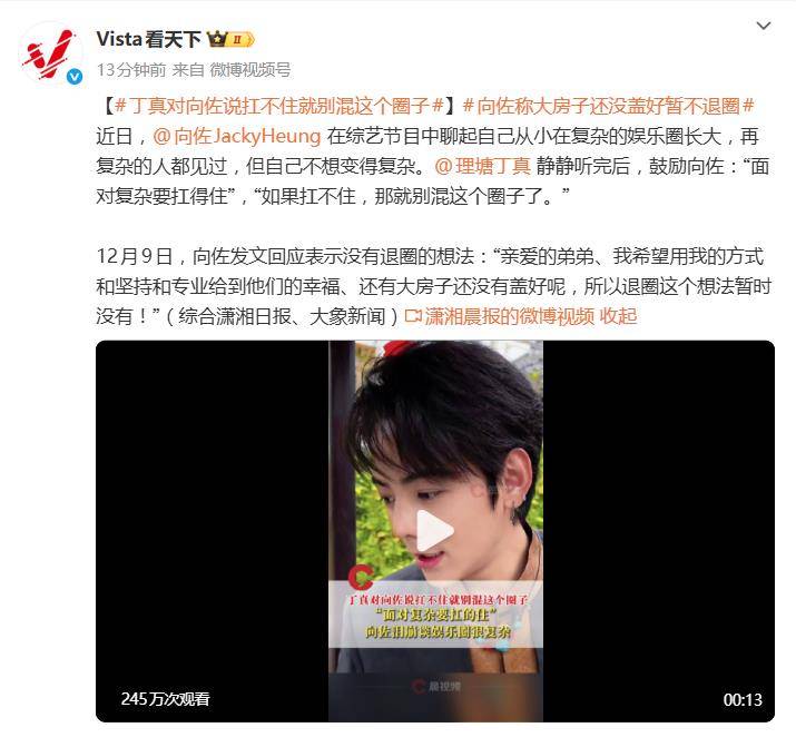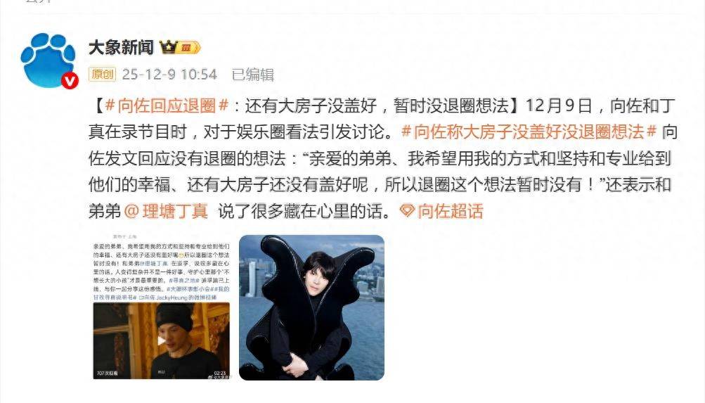 12月9日,向佐发长文明确表态:“退圈这个想法暂时没有!”理由很具体:一是要“用我的方式和坚持和专业给到他们幸福”,二是那句引人遐想的——“还有大房子还没有盖好呢”。这被迅速解读为,他对家庭的承诺还未兑现,事业还不能停。
