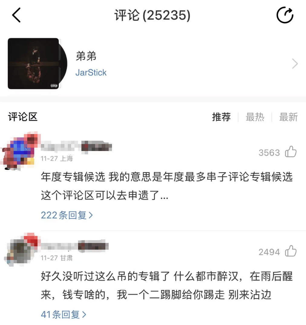 而Jarstick的《弟弟》更是夸张,可以说是中文说唱有史以来,串子最多的专辑评论区,2W多条评论不管是热评还是实时评论,那几乎全是反串。