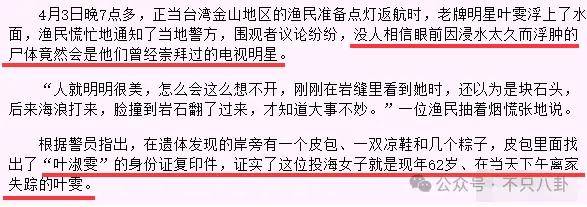 从当时的新闻来看,叶雯离家后不见踪影,家人报她失踪。后来她的遗体浮上水面被渔民发现,众人才知道,眼前因浸水太久而浮肿的尸体竟然是叶雯。