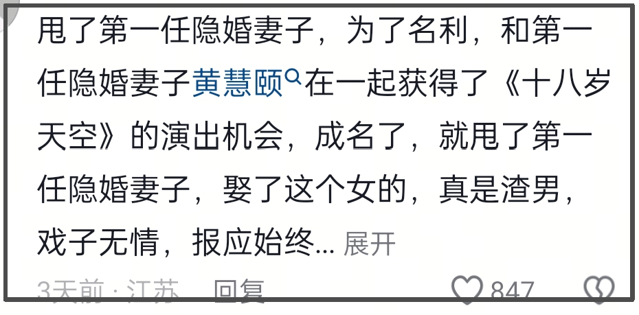 而隐婚的话题,则是因为黄慧颐说了一句“我都不说前什么了,就前任吧”,让网友认为是指两人有过一段婚姻,原本的“前”可能是前妻并非前任,也只有婚姻才会让人义无反顾的放弃所有。
