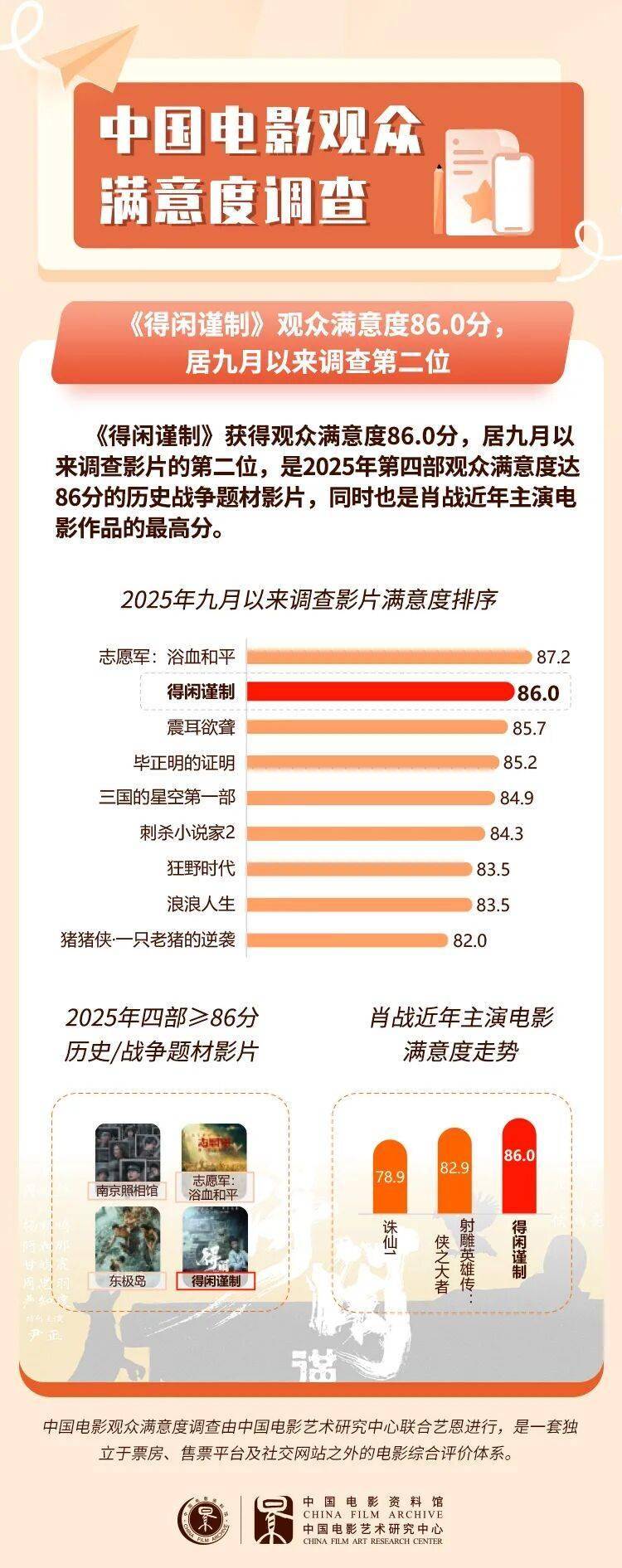 用荒诞现实主义手法讲述平民大众抗战故事的影片《得闲谨制》整体创作质量上乘,观众满意度86分,是2025年第四部满意度达86分的历史战争影片,在九月以来调查的影片中排位第二。