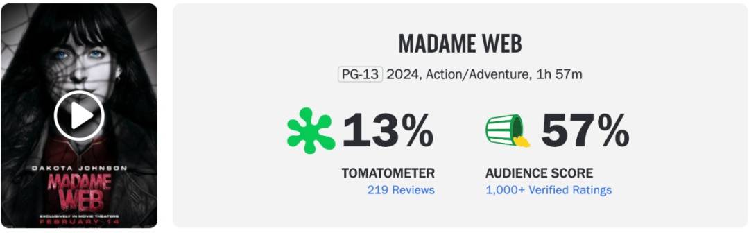 索尼和漫威合作的超级英雄电影。这片2月14日在北美已经公映,烂番茄新鲜度只有13%。