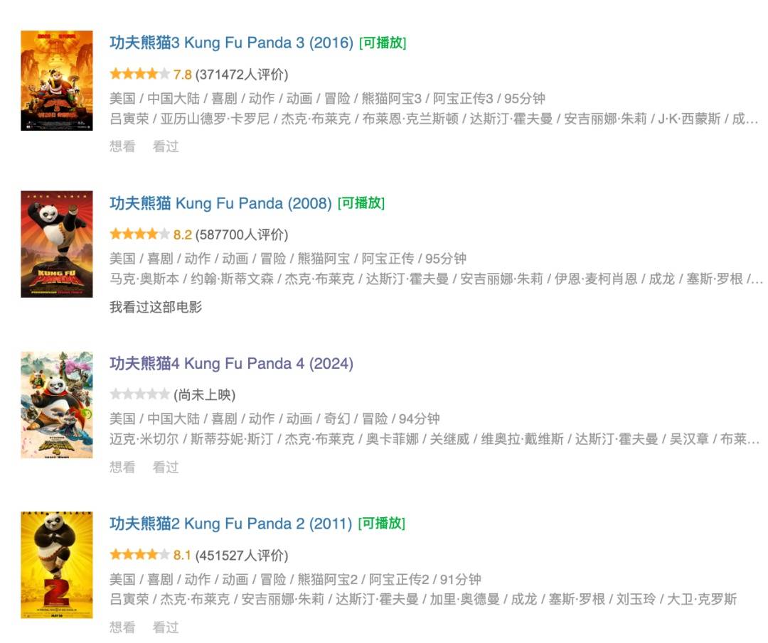 功夫熊猫系列,也是好莱坞的经典IP了。前三部虽然评价逐步下滑,但仍然在8.0分附近徘徊。