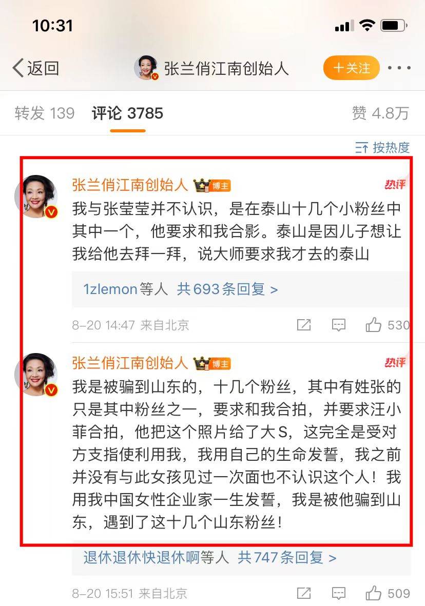 张兰直接否认认识张颖颖,认为自己被骗,以为和粉丝在一起合照,没有想那么多。但前员工孟贺发文力挺张颖颖,他们一起去爬泰山,大家都认识,并没有不认识,他认为张兰在撒谎。