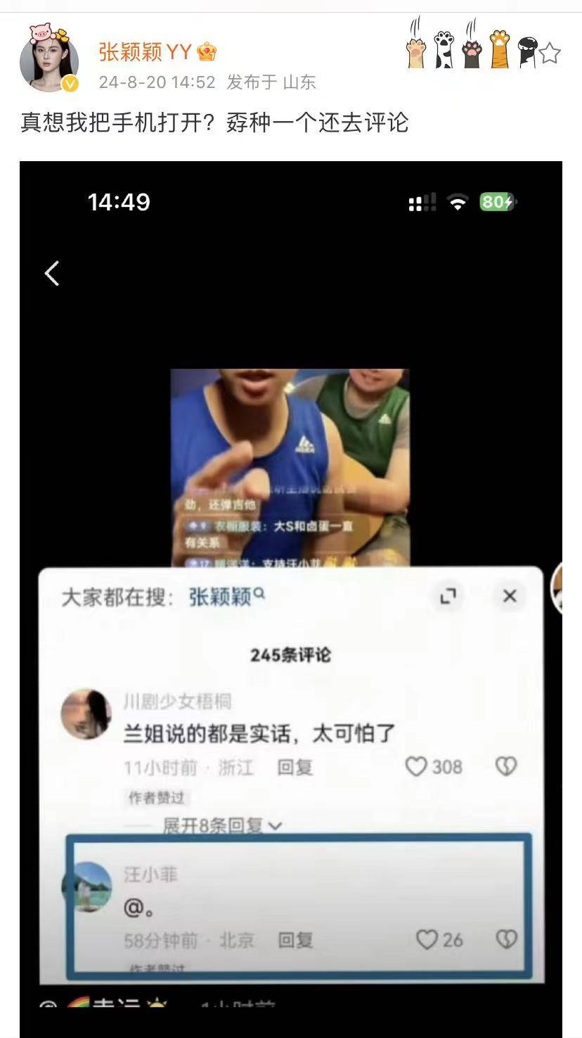 张颖颖开始矛头转向马筱梅,因为网友表示马筱梅也加入互撕阵营。张颖颖表示高看马筱梅了,以为她很聪明,想不到替男人挡枪。张颖颖似乎很了解汪小菲,认为他每次闹剧都是各路女方收尾,男方隐身。