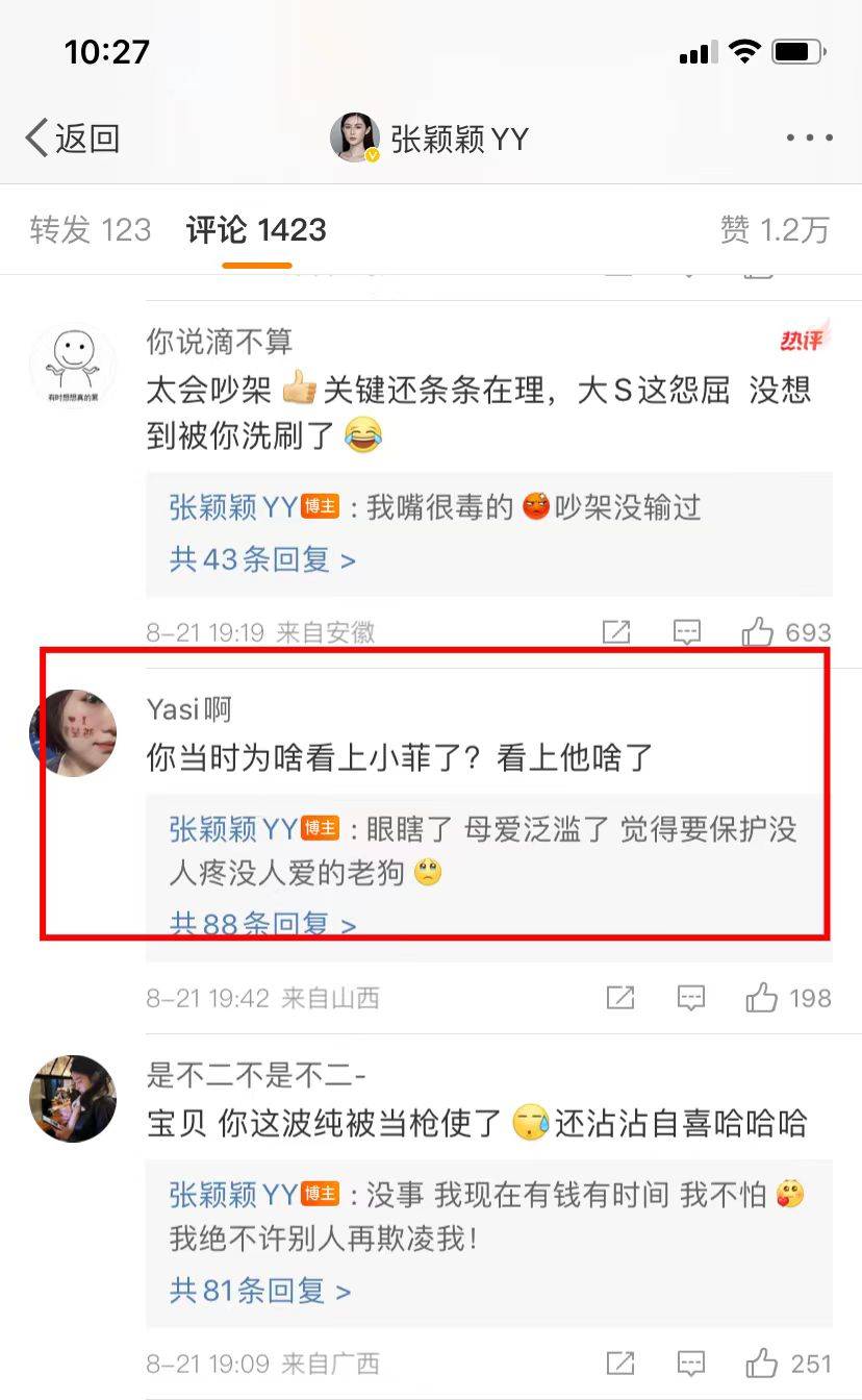 张颖颖回应网友当初为什么会看上汪小菲,张颖颖回应眼睛瞎了,母爱泛滥了,觉得要保护没人疼没人爱的老狗。