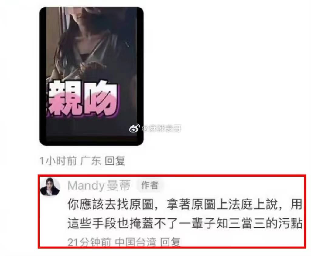 马筱梅(曼蒂)表示,网友应该去找原图,拿着原图上法庭上说,用这些手段也掩盖不了一辈子知三当三的污点。
