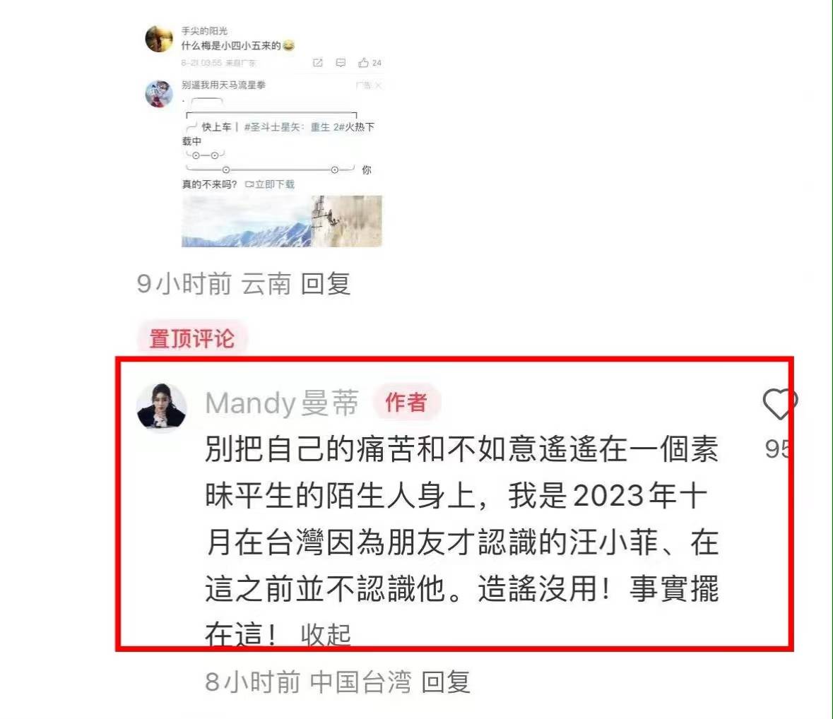 马筱梅还说别把自己的痛苦和不如意栽赃在一个素昧平生的陌生人身上,她是2023年10月在台湾因为朋友才认识的汪小菲,在这之前并不认识他,造谣没用,事实摆在这。