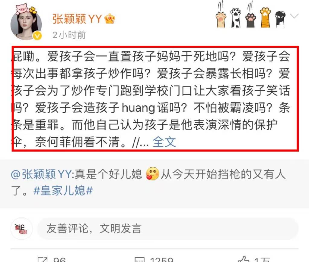 张颖颖再次炮轰汪小菲,表示他根本不爱孩子,爱孩子不会每次出事都拿孩子炒作,爱孩子不会暴露孩子的长相,爱孩子不会为炒作专门跑到学校门口让大家看孩子笑话等等。