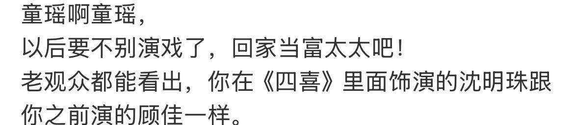 有剧迷一针见血地评论道:“老观众都看得出来,你演的沈明珠,和之前的顾佳几乎一模一样。”甚至有人调侃这是“童瑶第八次饰演顾佳”,足见其表演的固化已引发审美疲劳。
