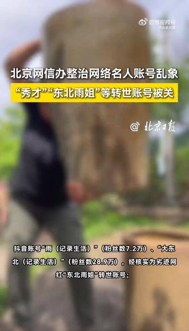 根据“清朗京华·网络名人账号乱象整治”专项行动的通报,抖音账号“雨(记录生活)”和“大东北(记录生活)”,经官方核实验证,被定性为“东北雨姐”团队运营的“转世账号”,意图规避主账号封禁限制,属于“违规变相复出”。与它们一同被依法依约关闭的,还有“猫一杯”的转世账号“碎嘴撸米”,以及“秀才”借壳复出的账号“王老四”。