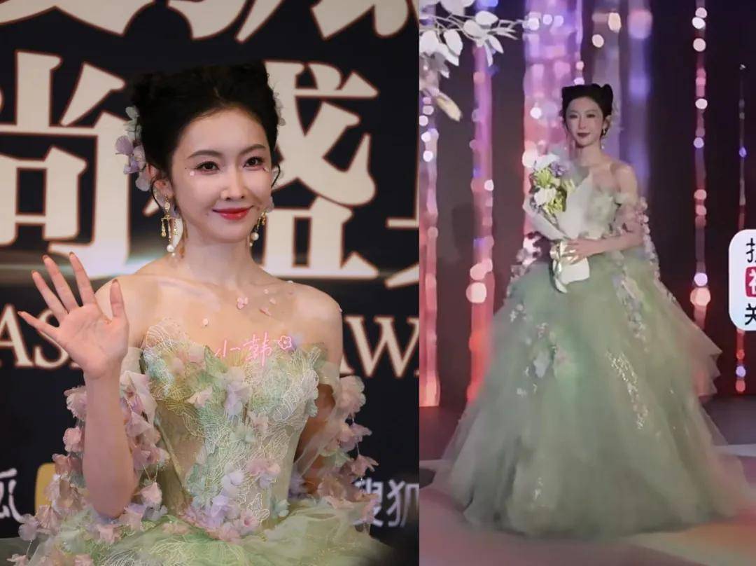 宣璐的花朵绿色蓬蓬纱裙造型就像在扮演花仙子,要是换个发型的话,其实有点像十几二十年前古装仙侠剧里的造型。