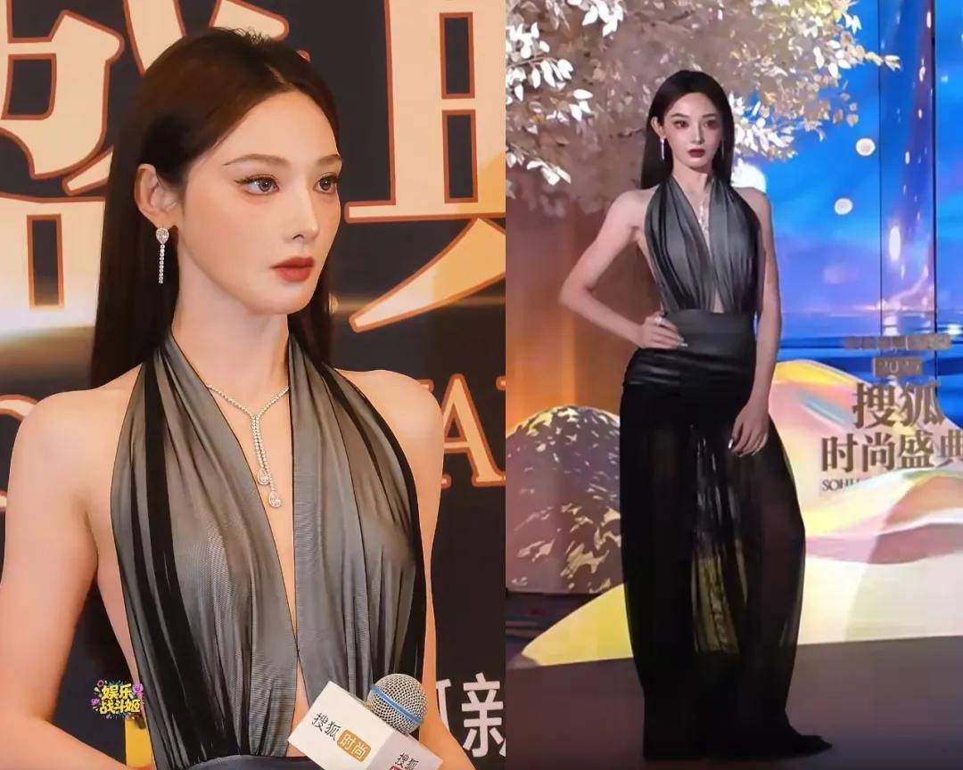 彭小苒穿了一条黑灰色挂脖纱裙,艳丽的妆容在她立体的五官上呈现出惊艳的效果,散发出一种很有攻击力的美。