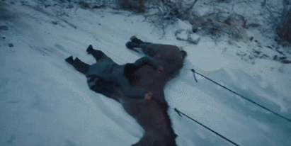 货郎佟长富(江奇霖 饰)家的马二条被巨大的铁钩勾住,在这个冰冷的松花江里下沉。