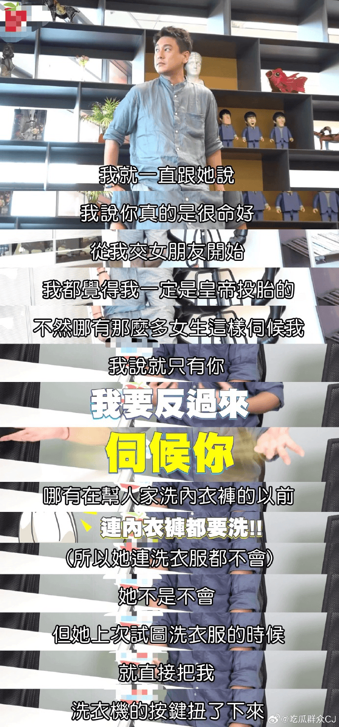 朱孝天说自己老婆命好,是因为他觉得自己皇帝投胎来的,“不然哪有那么多女生伺候我”,结果结了婚轮到他伺候老婆了。
