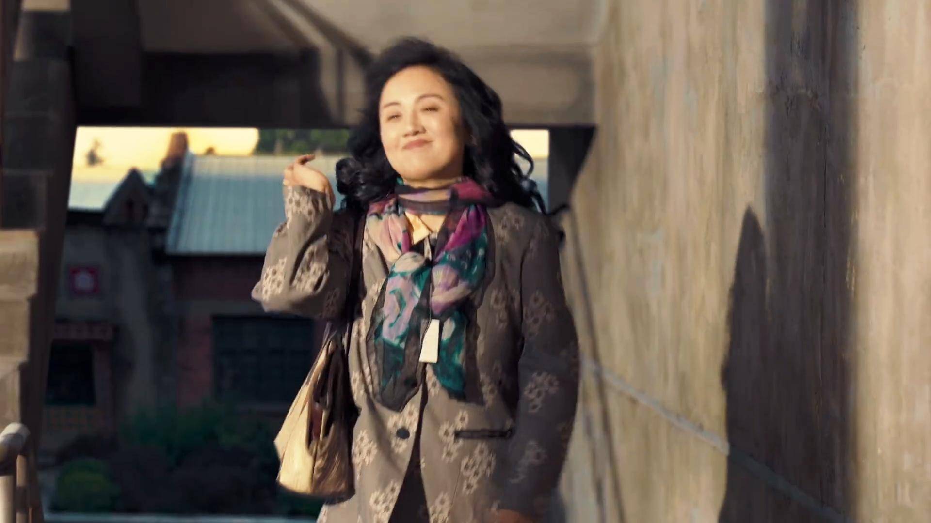 下一个镜头,她又步入老式居民楼,波浪卷发随着脸上的得意一同飘摇。