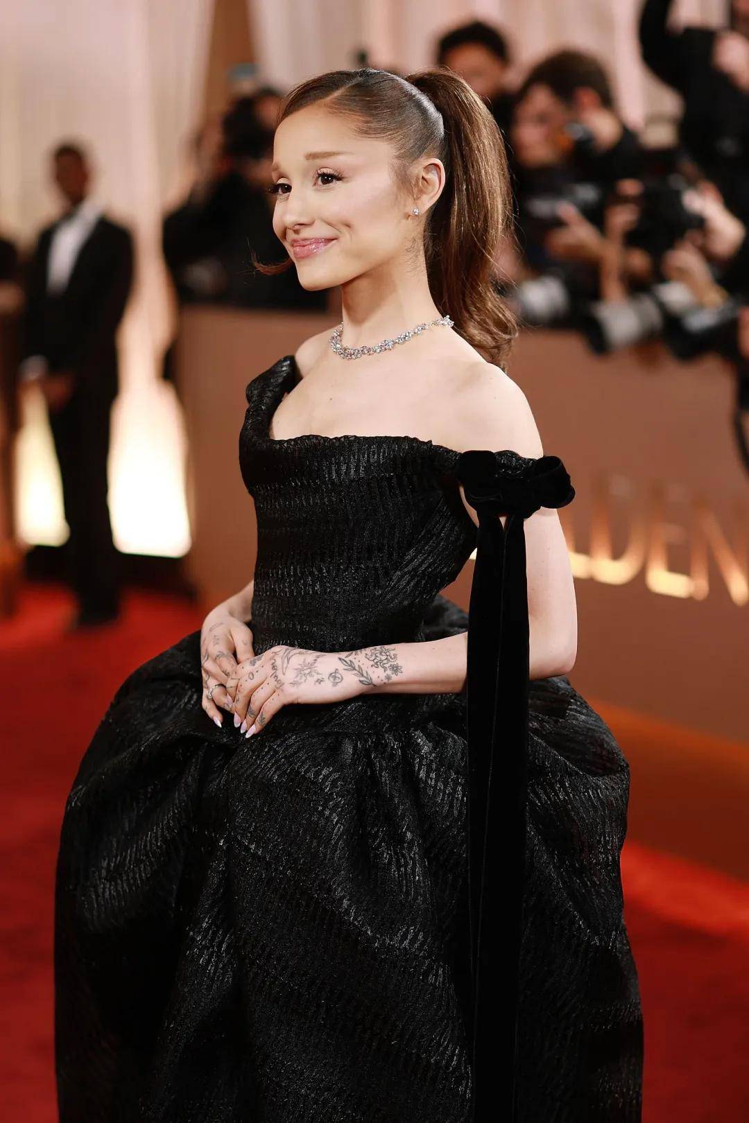 A妹Ariana Grande选了一件Vivienne Westwood定制礼服,标志性紧身胸衣搭配巨大朋克风裙摆,仿佛一只叛逆的黑天鹅。