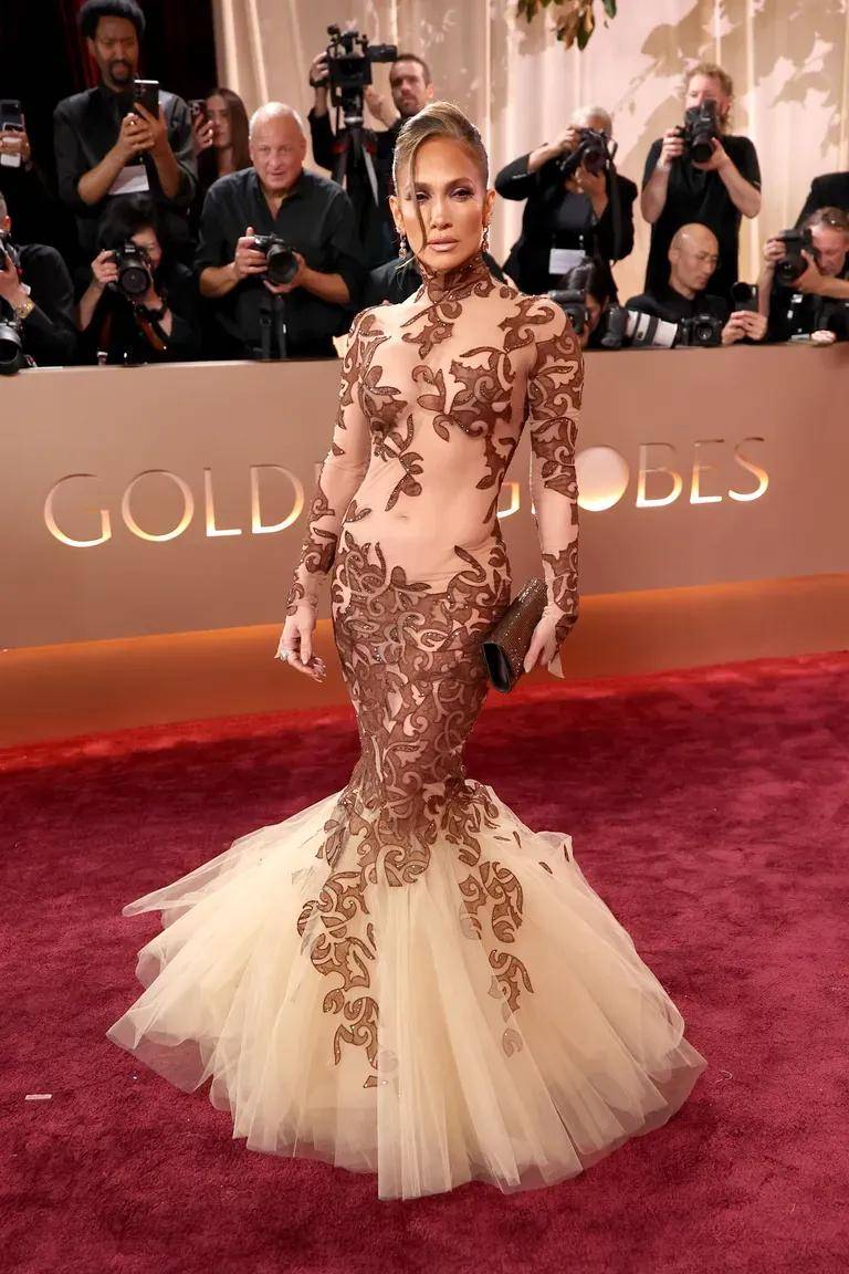 极致贴身的裸色设计,棕色的巴洛克风格刺绣蜿蜒全身,再加上一个蓬蓬纱鱼尾下摆,勾勒出完美曲线。搭配Sabyasachi高级珠宝,那种扑面而来的“富贵感”,真的很JLo。