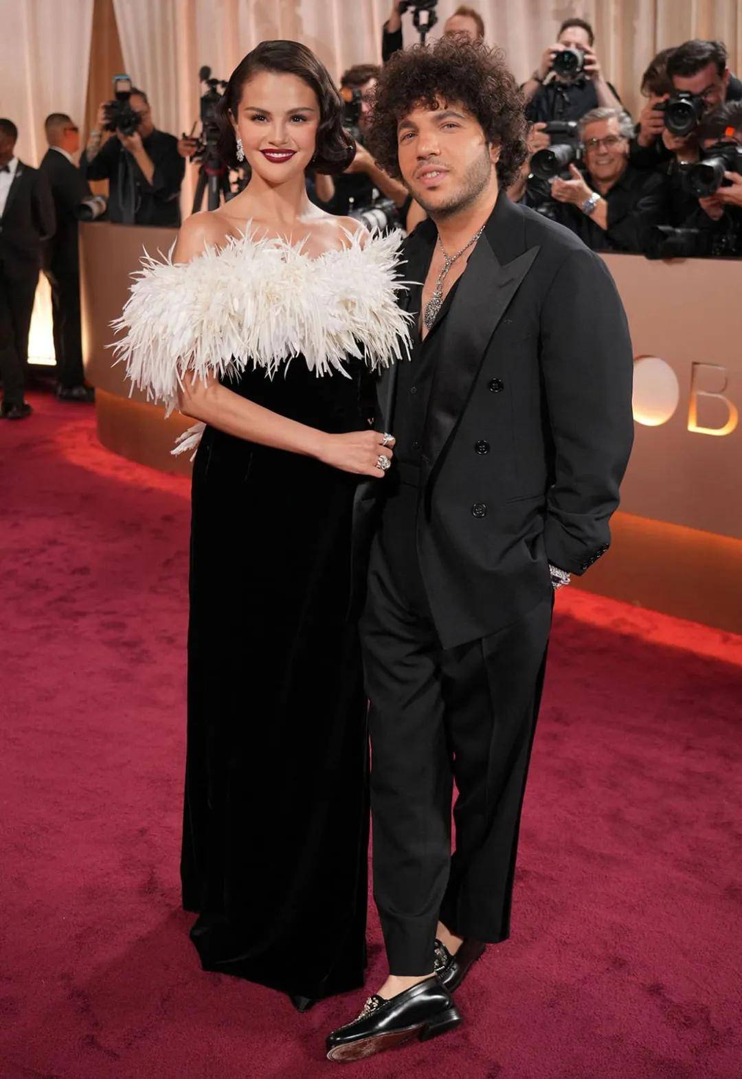 “傻脸娜”Selena Gomez瘦成一道闪电,身穿香奈儿定制天鹅绒礼服,领口的羽毛装饰很有好莱坞黄金时代的复古名伶范儿,耗时323小时完成。