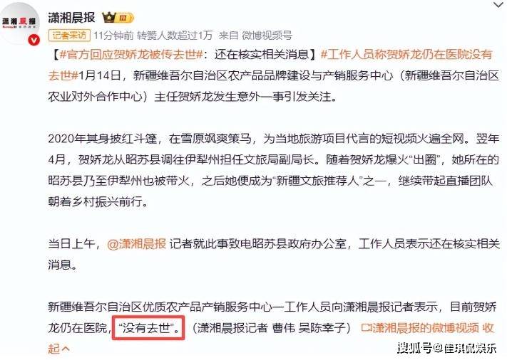 近日,走红网络的“网红文旅局长”贺娇龙被传去世的消息在网络上不胫而走。