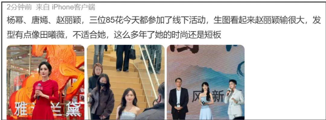 不过等到三位85花现场生图曝光,吐槽声就默默出现了,围观了赵丽颖、杨幂、唐嫣同台生图状态,有网友来了一句辣评,直言她们是“女明星和礼仪小姐”。