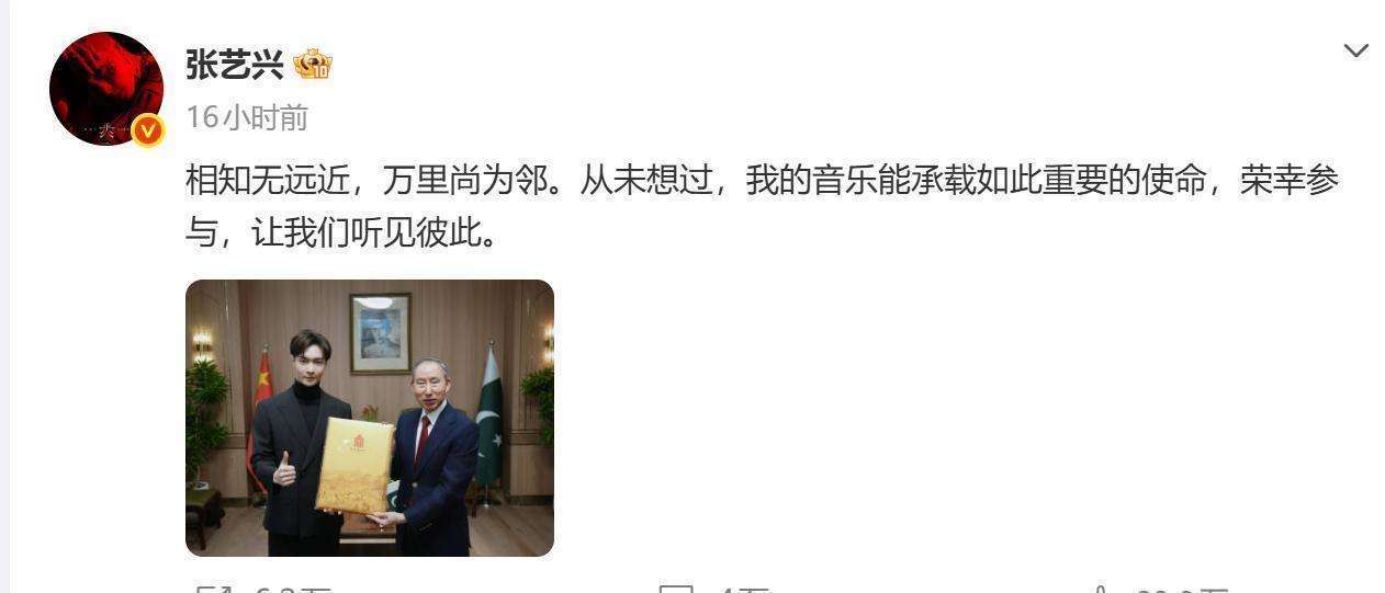此次参与中巴建交75周年文化交流活动,不仅是张艺兴个人影响力的体现,也证明了他扎根于中国文化土壤、而又胸怀世界的独特气质。他在社交媒体上写道:相知无远近,万里尚为邻。从未想过,我的音乐能承载如此重要的使命,荣幸参与,让我们听见彼此。他的这番话,既传递了对跨文化交流的真诚,也展现了他作为一位音乐人的责任与担当。