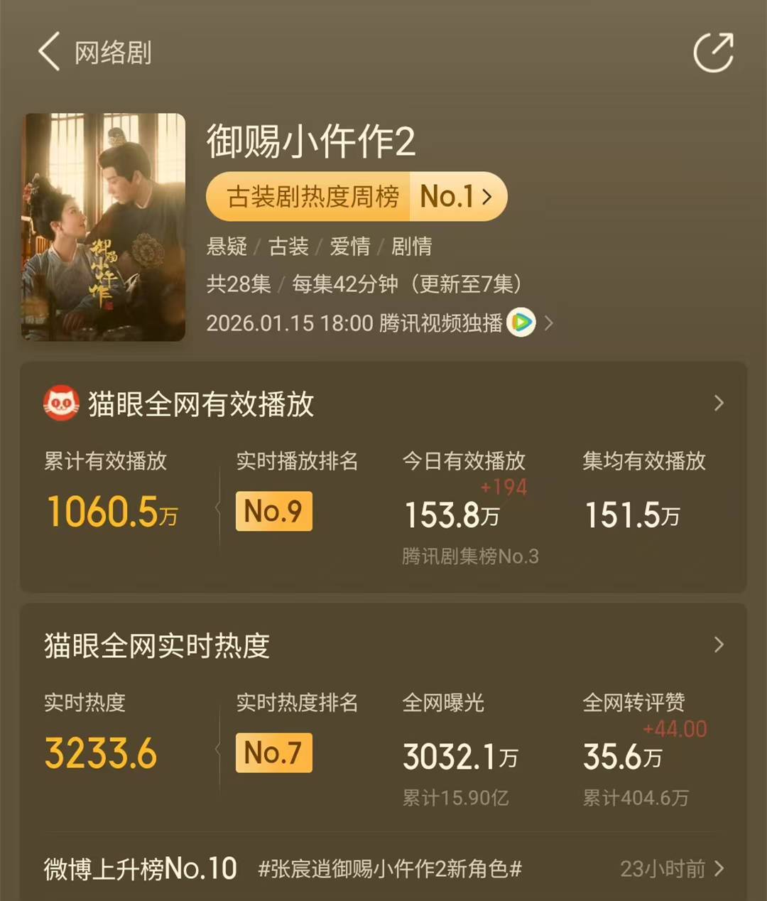 基于《御赐小仵作2》目前取得的播放成绩来看,它现在可能真的回归到“小成本”序列当中去了——虽然它这一部的质量明显看出有钱了,但它的播放数字,可能要在是否能过亿上使劲挣扎一下了。如果该剧的第二个探案故事依旧乏味的话,可能该剧会扑街到无声无息的程度。