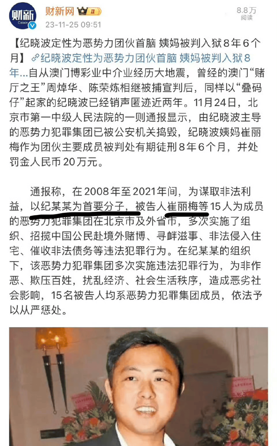 果真没多久,纪晓波的公司就出事了。2023年,纪晓波被定性为恶势力团伙的首脑,他的姨妈也被判入狱八年六个月。他的经历不禁让人想到了安以轩的老公陈荣炼,两人的产业都是与博彩业有关,而且纪晓波也是“叠码仔”起家。