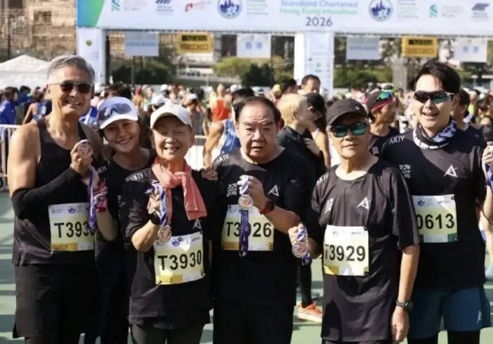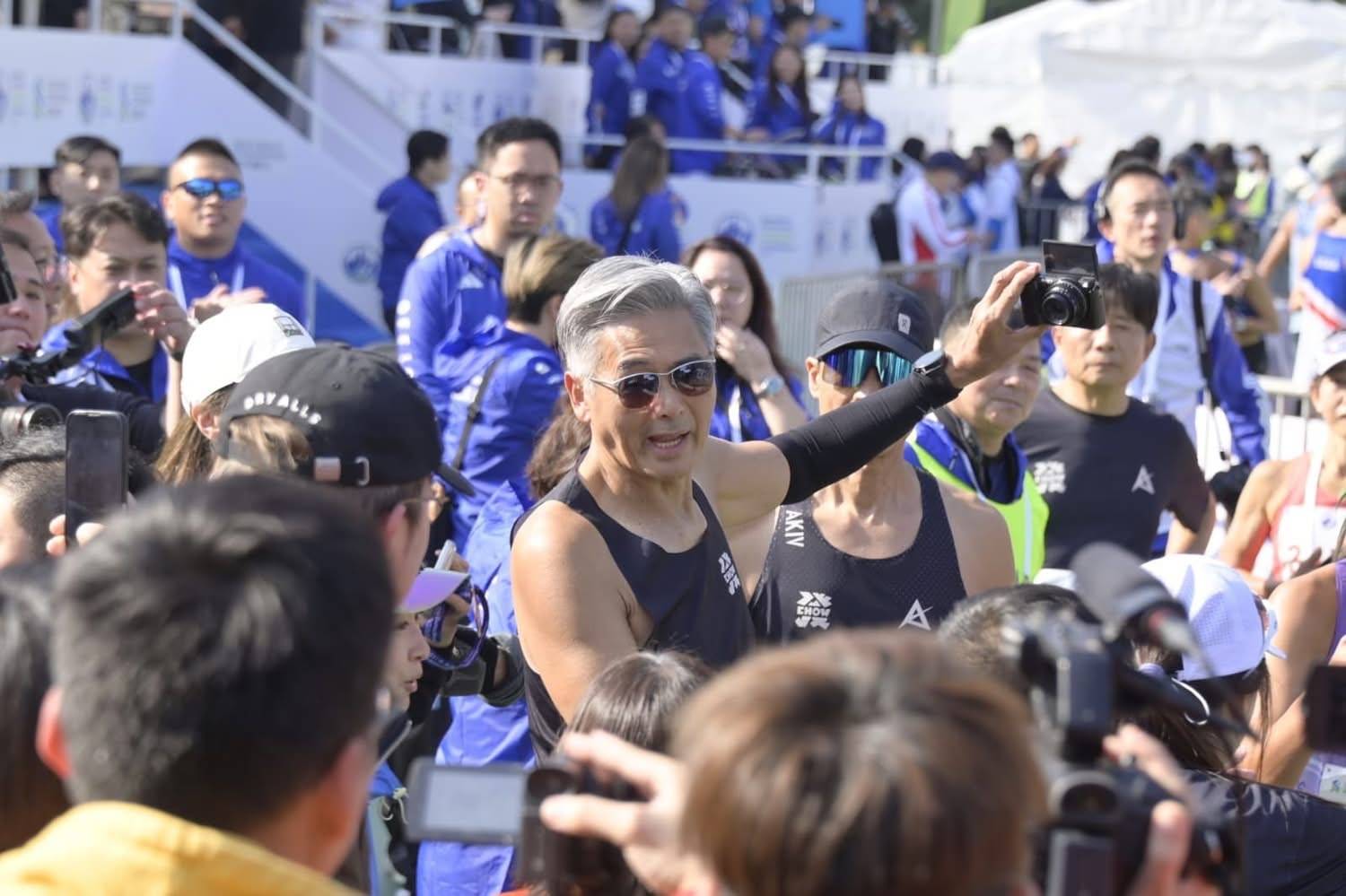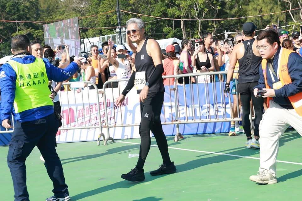 周润发透露这次选择10公里,是要陪伴刘江老师迈入80岁。他的身边还有76岁的鲍起静、74岁的郑则仕。四人完赛后对着镜头表示他们是几百岁的组合。提到全马赛事时,周润发笑言:“再等20年吧。”