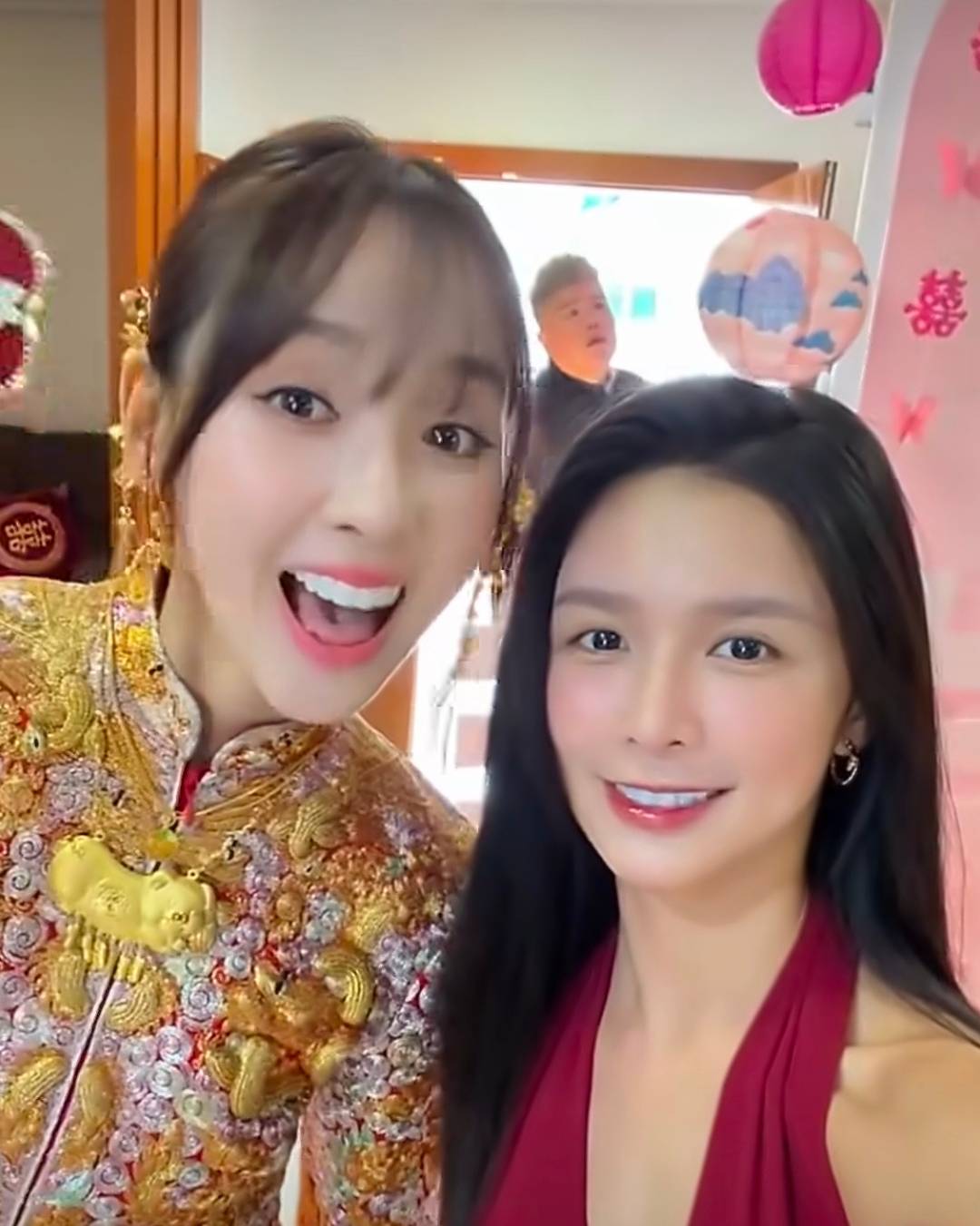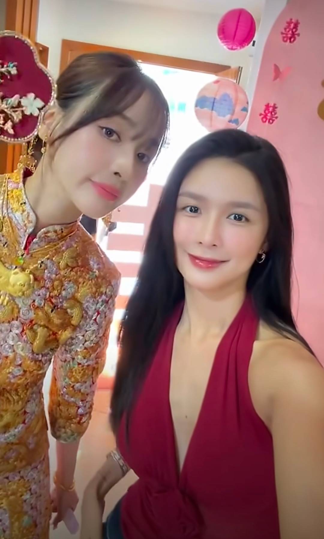 蔡卓宜着红裙与穿秀禾服的妹妹自拍,笑容甜美。