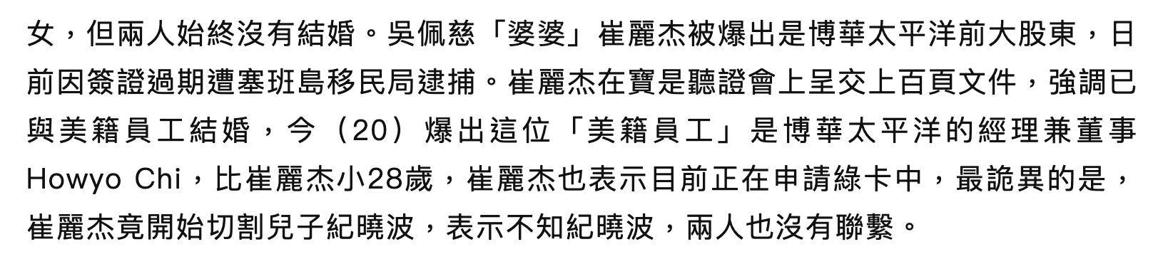 吴佩慈68岁的准婆婆崔丽杰因为违反了美国移民法,在塞班岛遭到美国移民以及海关执法局的人员拘捕,此事被公开报道后,引起热议与关注。崔丽杰在被拘捕之后不久,就被移送至听证会,她在会上透过翻译为自己进行辩护。在听证会上崔丽杰提交了上百页的文件,自证正在申请绿卡,同时还自曝已经再婚,最令人意外的是,她在听证会上与儿子纪晓波做了切割,称彼此完全没有联系。