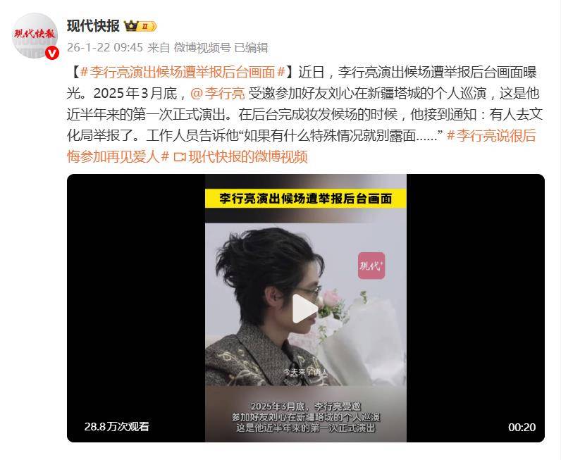 这一切的源头,是李行亮在节目中与妻子麦琳的相处模式被部分观众解读为“传播畸形价值观”。节目效应迅速溢出屏幕,演变成一场针对他个人的持久网络风暴。抵制从线上蔓延至线下,变得系统而精准:十余场已签约的演出因遭遇恶意举报接连被取消,典型案例是2025年在新疆塔城,他作为好友刘心巡演的助演嘉宾,已在后台完成妆发候场,却因举报电话打到当地文化部门,被临时通知“若有特殊情况别露面”,演出最终未开始即流产。这场流产的演出,竟成了他2025年全年唯一一次接近公开舞台的机会。