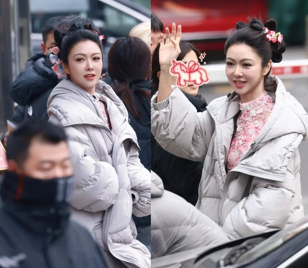薛凯琪的造型是女星中最独特的,她盘起了头发,用色彩缤纷的绒花点缀;她也没有好好穿羽绒服,露出了粉色布满花纹的裙子,喜庆且甜美。