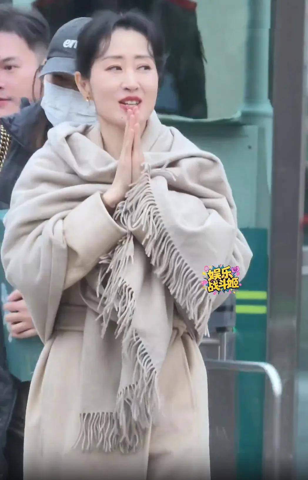 下班时刘敏涛化了全妆,换成一套棕色风衣,还披了一条同色系的披风,保暖且看起来更有亲和力。